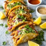 The image shows six small tacos arranged in a line on a white marbled surface, each with a crispy, light golden shell. The taco layers include a bottom layer of golden-brown cooked chicken pieces, topped with a colorful mix of finely shredded green, purple, and orange cabbage and carrots, garnished with fresh green cilantro leaves and sprinkled black and white sesame seeds. To the side, there are small white bowls filled with a red sauce and a black and white sesame seed mixture, along with a few yellow lemon wedges placed around the tacos. photo taken with an iphone --ar 4:5 --v 7