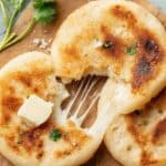 - Add Cheese Filling: Take one circle and place a couple of tablespoons of shredded mozzarella in the center, leaving a 1/2-inch border around the edges. Place a second dough circle on top and carefully seal the edges by pressing and smoothing between your palms to form a 1/2 inch thick disk. Repeat for remaining dough and cheese.