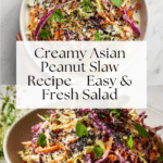 This vibrant Asian Peanut Slaw is a fresh and crunchy salad bursting with bold flavors. The creamy peanut dressing perfectly complements the shredded cabbage and carrots for an easy, healthy dish that’s great on its own or as a side.