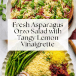 A fresh and vibrant Asparagus Orzo Salad featuring tender sautéed asparagus, sun-dried tomatoes, red onion, fresh basil, and crumbled feta, all tossed in a zesty lemon vinaigrette. Perfect as a light lunch or a side dish, this salad combines delightful textures and bright flavors for a refreshing Mediterranean-inspired meal.