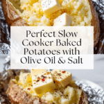 Keywords: baked potatoes, slow cooker potatoes, russet potatoes, olive oil potatoes, kosher salt, easy potato recipe, slow cooker side dish