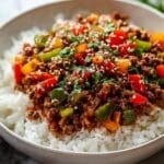 Keywords: beef rice bowl, ground beef recipe, sautéed peppers, quick dinner, easy beef recipe