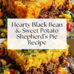 A hearty and nutritious Black Bean & Sweet Potato Shepherd’s Pie featuring a savory black bean and vegetable filling topped with creamy mashed sweet potatoes, baked to golden perfection. This vegetarian dish combines sweet and smoky flavors, perfect as a comforting meal for any occasion.