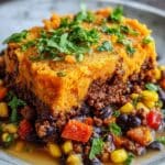 A hearty and nutritious Black Bean & Sweet Potato Shepherd’s Pie featuring a savory black bean and vegetable filling topped with creamy mashed sweet potatoes, baked to golden perfection. This vegetarian dish combines sweet and smoky flavors, perfect as a comforting meal for any occasion.