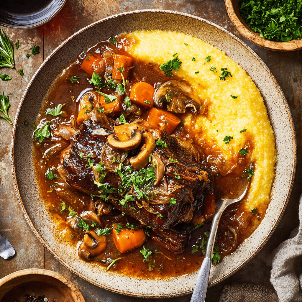 These Braised Short Ribs are a tender, flavorful comfort dish slow-cooked with red wine, aromatic herbs, and earthy mushrooms. The beef is seared to develop deep flavor, then braised low and slow until fork-tender. The rich sauce is beautifully enhanced with garlic, tomato paste, and fresh herbs, making a perfect meal served over creamy polenta, mashed potatoes, or buttered noodles.