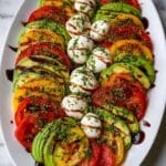 You can prepare most of the ingredients ahead of time, but it’s best to add the avocado slices, basil leaves, and balsamic glaze just before serving to keep everything fresh and vibrant.