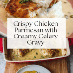 This Chicken Parmesan and Gravy recipe features tender chicken cutlets baked in a savory cream of celery soup base with white wine, flavored with garlic, rosemary, and paprika. Topped with pecorino romano cheese and Italian bread crumbs, then broiled to a golden finish, this comforting dish pairs perfectly with mashed potatoes or rice for a hearty meal.