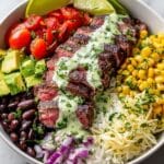 Keywords: cilantro lime steak bowls, flank steak recipe, easy steak bowl, Mexican bowl, healthy steak recipe, rice bowl, cilantro dressing