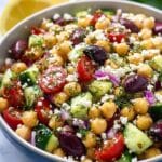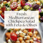 Keywords: Mediterranean chickpea salad, healthy salad, vegetarian salad, Mediterranean diet, chickpea recipe, feta cheese salad