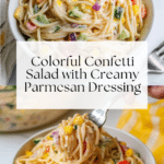 This vibrant Confetti Salad is a colorful and refreshing pasta salad packed with crunchy vegetables and coated in a creamy, tangy homemade dressing. Perfect for potlucks, picnics, or a light lunch, this salad combines tender spaghetti with diced red pepper, onion, cucumber, celery, and sweet corn, all tossed in a flavorful mayo and sour cream-based dressing enriched with parmesan, Dijon mustard, and Worcestershire sauce.
