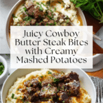 Keywords: cowboy butter, steak bites, ribeye steak, mashed potatoes, creamy potatoes, herb butter, quick steak recipe, skillet steak, comfort food