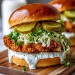 This Crispy Dill Chicken Sandwich features juicy, buttermilk-marinated fried chicken breasts coated in a flavorful dill-infused batter, topped with a fresh dill aioli, shredded lettuce, cheddar cheese, and dill pickle chips, all sandwiched between toasted brioche buns. Perfectly crispy on the outside and tender inside, this sandwich combines tangy, herbal, and savory flavors for a deliciously satisfying meal.