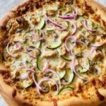 A round pizza with a thick crust that is golden brown and slightly puffed, topped with melted cheese that is creamy white and lightly browned in spots. On top, there are thin slices of red onion arranged in loose loops, small chunks of cooked chicken with a light beige color, thin strips of green zucchini, and thin slices of mushrooms with a tan and brown tone. The toppings are spread evenly over a lightly browned base layer of cheese, all on a wooden board resting on a white marbled texture. Photo taken with an iphone --ar 4:5 --v 7