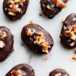- Dip in Chocolate: Using a toothpick to hold each date, dip it into the melted dark chocolate until fully coated. Transfer the coated dates to a baking sheet lined with parchment paper. Sprinkle with extra crushed peanuts and a pinch of sea salt if desired.