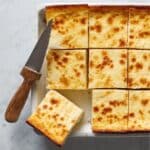 The image shows a white square dish with nine pieces of a baked dessert cut into even squares. The dessert has a light golden top with slightly darker brown spots, suggesting a soft, creamy texture. One square piece is slightly lifted by a knife with a wooden handle resting on the white marbled surface next to the dish. The dessert looks smooth on the inside and firm on the outside, with no visible layers. photo taken with an iphone --ar 4:5 --v 7