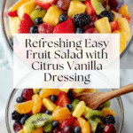 This Easy Fruit Salad Recipe combines a colorful assortment of fresh fruits with a homemade citrus-vanilla glaze. The dressing is a sweet and tangy blend made from orange and lemon juice, brown sugar, and zest, simmered to a slight thickness and enhanced with vanilla extract. Tossed together and chilled for several hours, this refreshing fruit salad is perfect as a healthy dessert or side dish for any occasion.