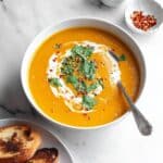 - Serve and garnish: Ladle the soup into bowls and garnish with optional coconut milk, fresh cilantro, crushed red pepper, a squeeze of lemon juice, and a drizzle of extra virgin olive oil to enhance the flavors.