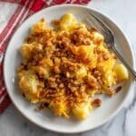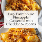 A delightful farmhouse-style pineapple casserole featuring sweet pineapple chunks layered with a sugar and flour mixture, topped with sharp cheddar cheese, crunchy buttered Ritz cracker crumbs, and toasted pecans. Baked to golden perfection, this comforting casserole combines sweet, savory, and crunchy textures, making it a wonderful side dish or dessert option.
