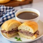 Keywords: French dip sandwich, roast beef sandwich, au jus, beef sandwich, easy sandwich recipe, stovetop French dip