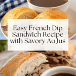 This classic French Dip Sandwich recipe features thinly sliced roast beef served on toasted French rolls with a flavorful homemade au jus dipping sauce. The beef is warmed in a savory broth made from beef stock, Worcestershire sauce, soy sauce, and sautéed onions and garlic, creating a rich, comforting sandwich perfect for lunch or dinner.