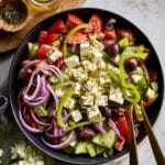 This classic Greek Salad recipe combines fresh vegetables, tangy olives, and creamy feta cheese dressed in a simple olive oil and red wine vinegar dressing seasoned with oregano, salt, and pepper. It’s a vibrant, refreshing salad perfect as a side dish or light meal, offering a burst of Mediterranean flavors.