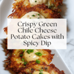 Deliciously crispy Green Chile Cheese Potato Cakes served hot with a cooling Green Chile Sour Cream dipping sauce. These savory potato cakes combine shredded potatoes, creamy cheeses, and spicy green chile for a flavorful appetizer or side dish.