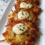 Deliciously crispy Green Chile Cheese Potato Cakes served hot with a cooling Green Chile Sour Cream dipping sauce. These savory potato cakes combine shredded potatoes, creamy cheeses, and spicy green chile for a flavorful appetizer or side dish.