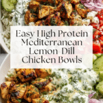 These High Protein Mediterranean Lemon-Dill Chicken Bowls are an easy, flavorful meal prep-friendly dish featuring marinated grilled chicken, fluffy basmati rice, fresh vegetables, tangy feta, and homemade tzatziki sauce. Perfect for a healthy, balanced lunch or dinner with vibrant Mediterranean flavors.