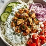 This High Protein Mediterranean Lemon-Dill Chicken Bowl is a fresh, vibrant meal perfect for quick dinners or meal prep. Featuring juicy marinated chicken, fluffy basmati rice, crisp vegetables, and a tangy tzatziki sauce, it’s a balanced dish full of flavor and texture.