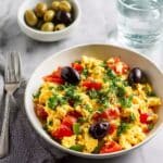 A vibrant and flavorful Mediterranean breakfast bowl featuring fluffy scrambled eggs mixed with feta cheese, Kalamata olives, bell peppers, scallions, and fresh basil. This quick and easy recipe brings fresh ingredients together for a nutritious and satisfying morning meal.