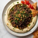 This delicious hummus with ground beef combines creamy, zesty chickpeas with spiced, savory meat and crunchy pine nuts. It’s a satisfying dish perfect for sharing as a snack or appetizer. Serve it with warm pita for a crowd-pleasing Mediterranean treat.