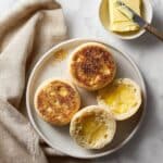 These irresistible sourdough discard English muffins are perfect for using up starter while creating a delicious breakfast treat. Cooked on the skillet, they develop a golden crust with a tender, chewy interior full of nooks and crannies ready to hold melted butter and jam.