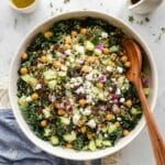 A vibrant and nutritious Kale Quinoa Salad tossed with a zesty lemon dressing. This salad combines tender massaged kale, protein-rich quinoa and chickpeas, crunchy pepitas, sweet golden raisins, and tangy feta cheese, all enhanced by fresh herbs and a bright lemon dressing. Perfect as a light lunch or a wholesome side dish.