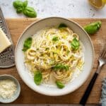 10. Serve: Divide the pasta into 4 warmed bowls. Top each serving with the remaining Parmesan, torn fresh basil leaves, extra lemon zest, cracked black pepper, and a drizzle of extra virgin olive oil. Serve immediately while warm.