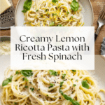 This refreshing Lemon Ricotta Pasta features a creamy, zesty sauce made from whole milk ricotta, fresh lemons, garlic, and Parmesan cheese. Tossed with spaghetti and brightened by fresh baby spinach and basil, this quick and simple Italian-inspired dish is perfect for a light yet satisfying meal.