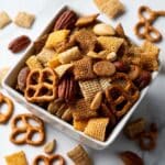 Keywords: party snack mix, chex mix recipe, crunchy snack mix, savory snack mix, homemade snack mix, baked snack, cheesy snack mix