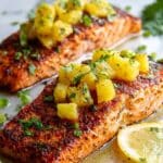This Pineapple Glazed Salmon recipe features tender, flaky salmon fillets coated in a sweet and tangy pineapple glaze made from fresh pineapple, honey, soy sauce, and aromatic garlic and ginger. Baked to perfection and garnished with fresh cilantro, it offers a delightful balance of tropical flavors and savory richness, perfect for a healthy and flavorful meal.