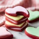 A stack of heart-shaped cookies with three visible layers each, the bottom layer is a deep red cookie, the middle layer is smooth pastel-colored icing in pink, green, or light yellow, and the top layer is a thick, smooth icing of matching pastel color. The top cookie in the stack is pink with a bite taken out, revealing the red cookie beneath. A few more cookies with pastel green and pink icing lie flat on a white marbled surface beside the stack, with a pink and white striped cloth softening the background. The lighting is bright and natural, highlighting the rich colors and textures. photo taken with an iphone --ar 4:5 --v 7