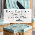 Keywords: Robin Egg Cake, snack cake, speckled frosting, spring dessert, Easter cake, vanilla cake, buttercream frosting