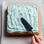 - Remove Cake and Frost: Carefully lift the parchment edges to remove the cooled cake from the pan. Spread the frosting generously over the top.