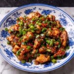A white plate with blue floral design holds a dish of cooked chicken pieces, browned and glistening with a shiny, oily sauce. The chicken is mixed with chopped bright green onions scattered on top and throughout. The chicken pieces look tender with slightly crisp edges, and the sauce has a rich reddish-brown color mixed with green from the onions, giving the dish a lively and flavorful appearance. The plate is set on a white marbled textured surface. photo taken with an iphone --ar 4:5 --v 7