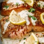 - Serve: Cut the salmon into individual fillets. Pour the creamy lemon sauce over each piece and garnish with fresh chopped parsley. Serve with additional lemon wedges on the side.