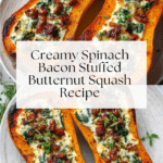 This Stuffed Butternut Squash recipe features tender roasted squash halves filled with a creamy mixture of sautéed spinach, cream cheese, Parmesan, and crispy bacon. Finished with fresh thyme and a golden cheese crust, this dish is a comforting and flavorful option perfect as a hearty side or a vegetarian-friendly main when bacon is omitted.