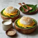 This Thai Mango Sticky Rice recipe features glutinous rice steamed to perfection and infused with creamy coconut milk and sweetened with ube halaya for a unique twist. Served with ripe mango slices and a luscious coconut sauce, this classic Thai dessert balances chewy, sweet, and creamy textures for an irresistible tropical treat.