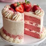 This luscious strawberry cake combines a white cake mix with strawberry gelatin and pureed strawberries for a moist, flavorful dessert. Topped with a creamy strawberry cream cheese frosting and optional fresh strawberry slices, this cake is perfect for any celebration or a sweet treat.