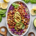 - Combine and Season: Remove the skillet from heat and allow the vegetable mixture to cool slightly. Stir in the red wine vinegar, chili powder, cumin, and if using, the vegan sugar. Pour this mixture over the chickpeas in the large bowl. Add the chopped red cabbage, cilantro (or parsley), chopped basil leaves, and freshly squeezed lemon juice. Mix everything thoroughly until well combined. Serve the salad either cold or slightly warm depending on preference.
