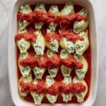 5. Stuff the Shells: Using a spoon or piping bag with a large tip, fill each jumbo shell with approximately 2 tablespoons of the spinach ricotta mixture. Place the stuffed shells seam side up in the baking dish on top of the marinara sauce. Continue this process until all the filling is used.
